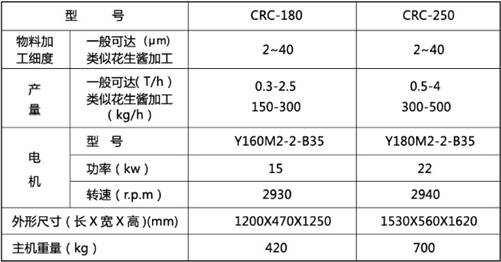 CRC series ultrafine grinding mill with good crushing performance. Oh aircraft that figure is widely applicable to micro- processed foods , paints, plastic colorants , various paints , dyes and other materials difficult process , especially for peanut butter, chili sauce, rapeseed , sunflower , mustard , cocoa, almonds and other high oil content of materials processing. Which is characterized by high yield, fine grain size, small temperature rise.